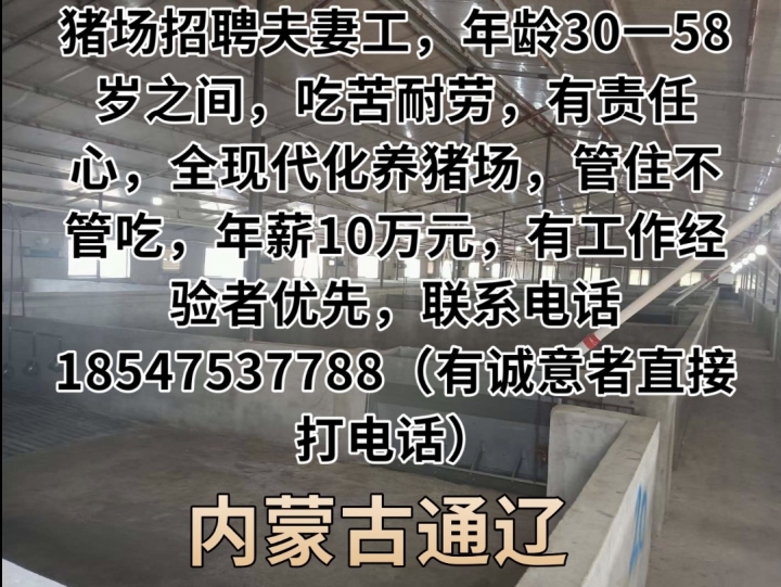 猪场招聘夫妻工,年龄30一58岁之间,吃苦耐劳,有责任心,全现代化养猪场,管住不管吃,年薪10万元,有工作经验者优先,联系电话18547537788(有诚意者直接打电话)