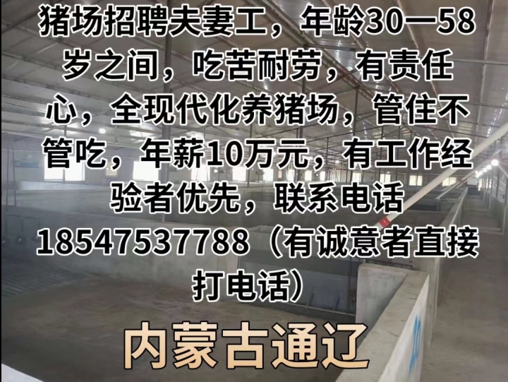 猪场招聘夫妻工,年龄30一58岁之间,吃苦耐劳,有责任心,全现代化养猪场,管住、管吃,年薪10万元,有工作经验者优先,联系电话18547537788(有诚意者直接打电话)