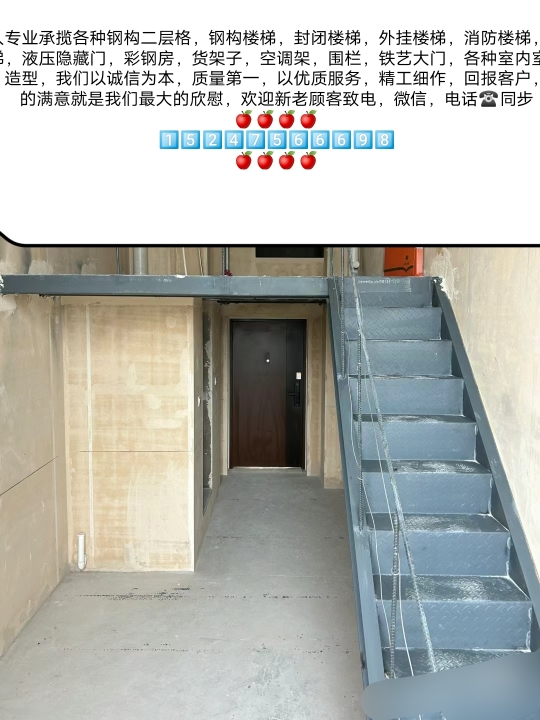 本人专业承揽各种 铁艺楼梯,钢构二层格,封闭楼梯,外挂楼梯,伸缩楼梯,消防楼梯,液压隐藏门,货架子,空调架,堵楼梯口,酒柜,造型吧台,铁艺围栏,铁艺大门,等等各种室内,室外楼梯,钢构二层格,各种铁艺造型焊接,欢迎新老客来电话 微信同步15247566698
